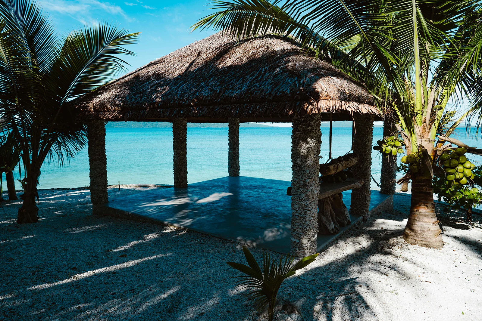 Nearby bathrooms and showers ensure guests can move easily between the sea and the comfort of the shaded beach spaces.